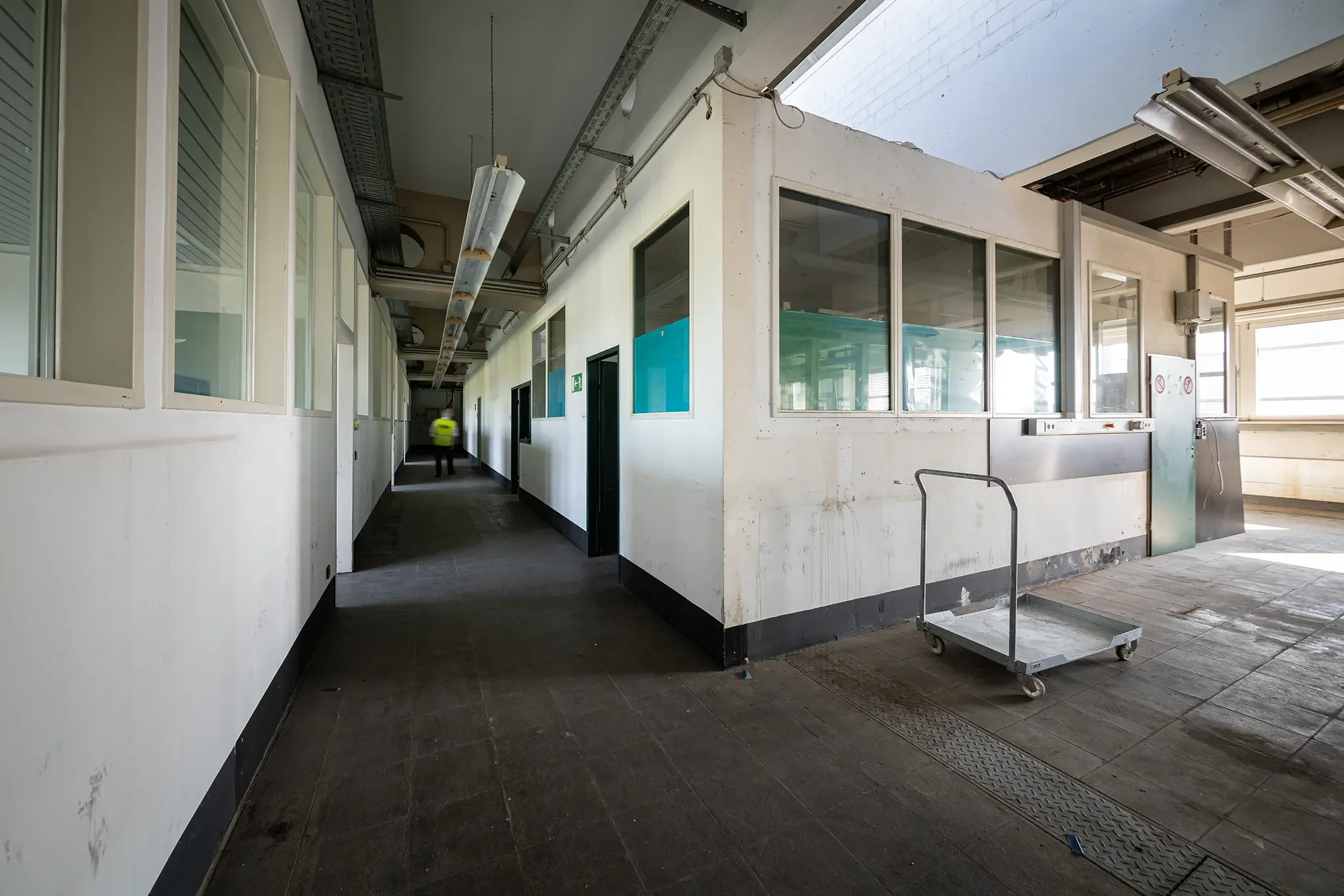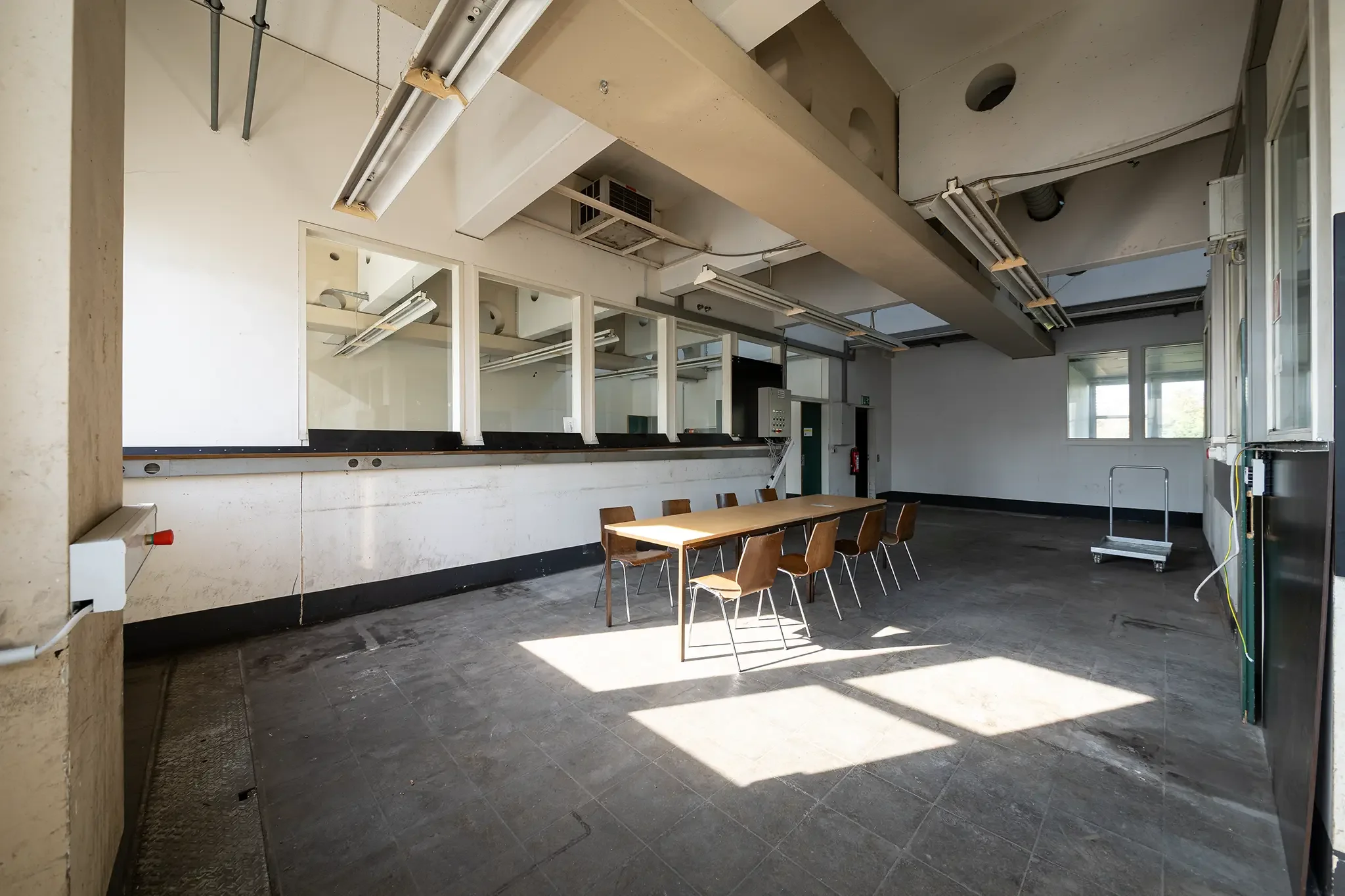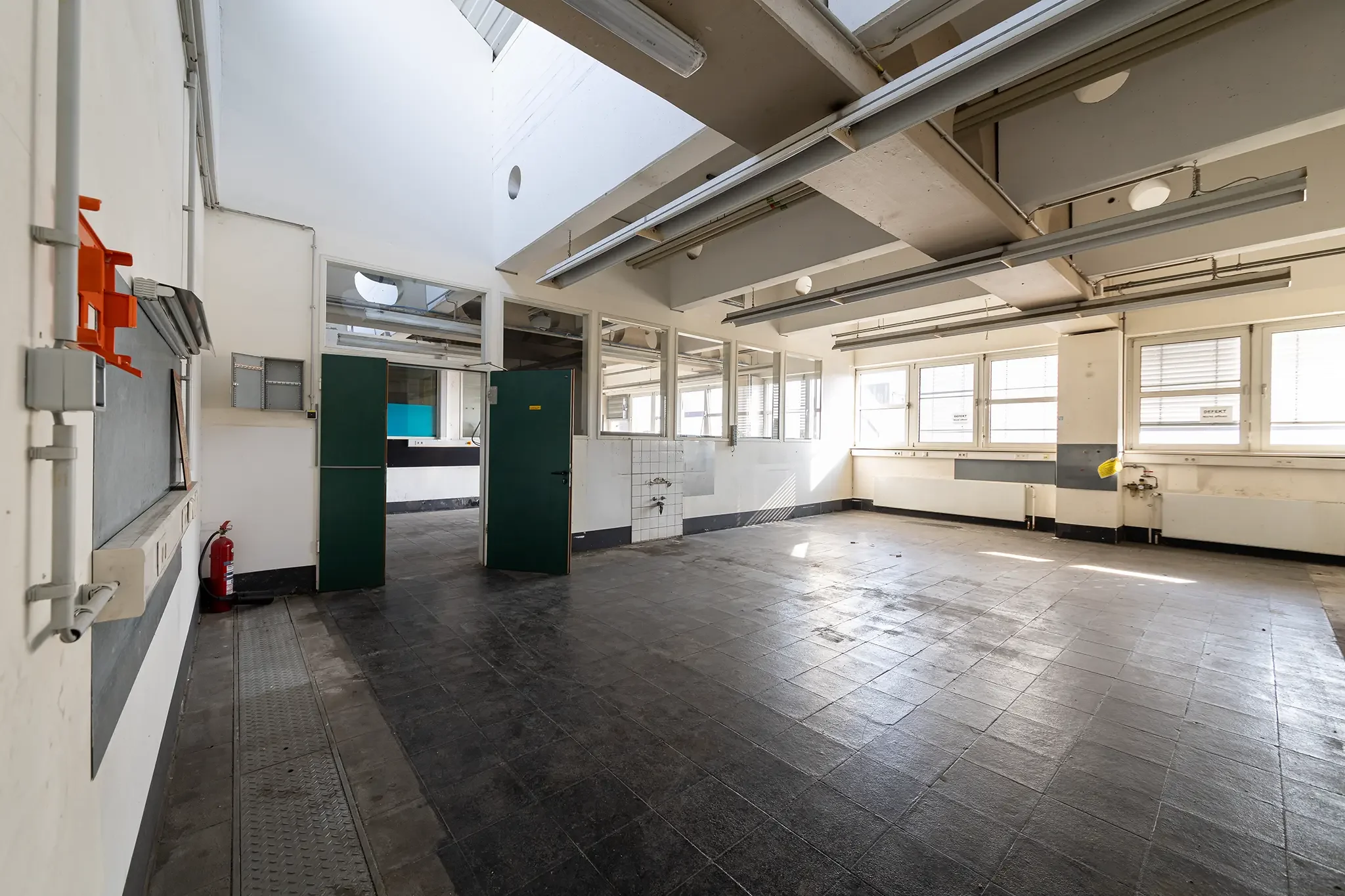 Der erste Eindruck bestätigte sich dann bei der Besichtigung des Werkstattgebäudes F260, ganz oben im dritten Stock. Was man dort fand? Rund 830 Quadratmeter Fläche, Beton, PVC-Boden, hohe Decken, viel Licht – aber auch Kälte, Staub und baulicher Charme der 80er Jahre. Heizung? Fehlanzeige. Steckdosen? Der Strom auf dem gesamten Gelände war schon seit Monaten abgestellt. Brandschutz? Undenkbar.
