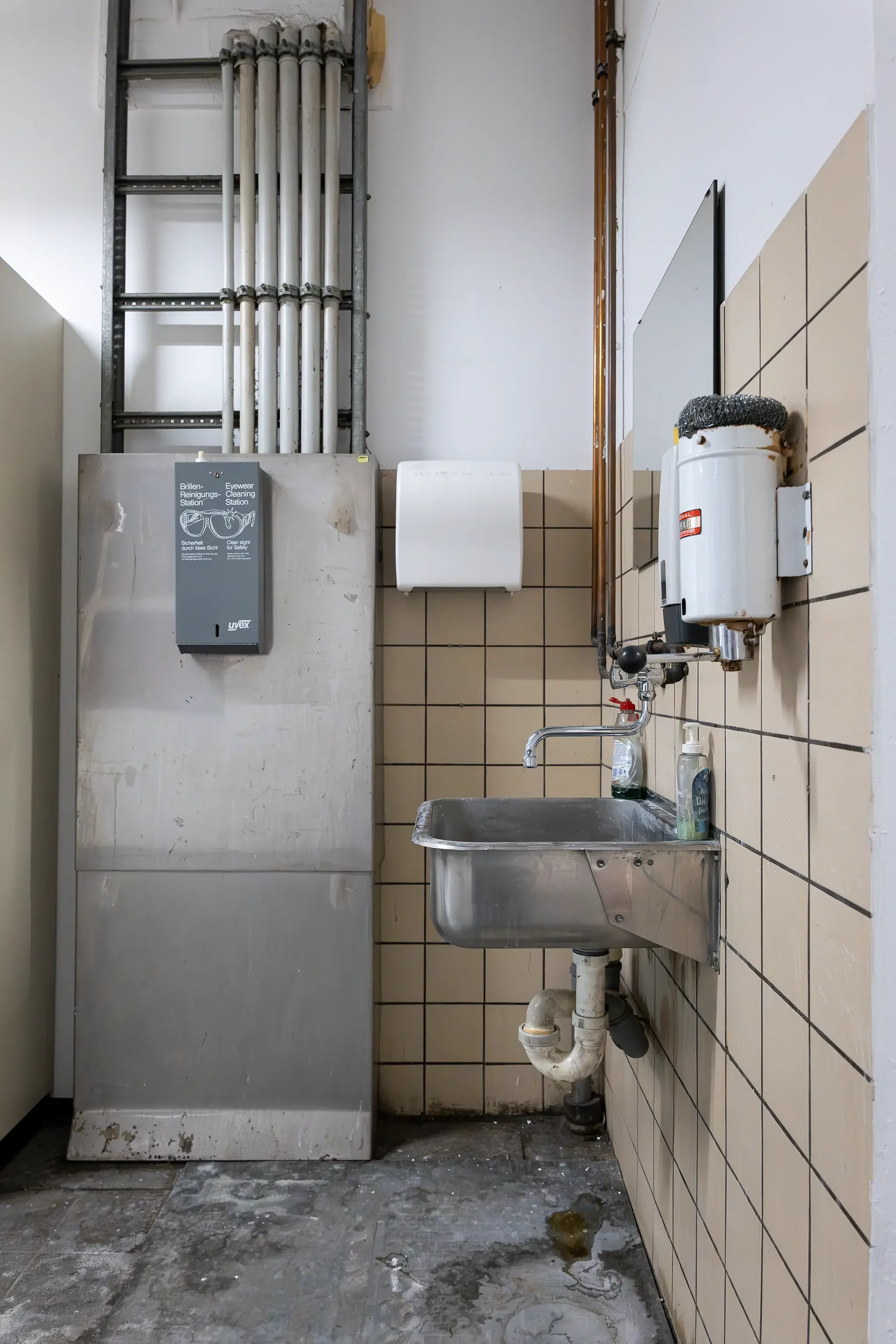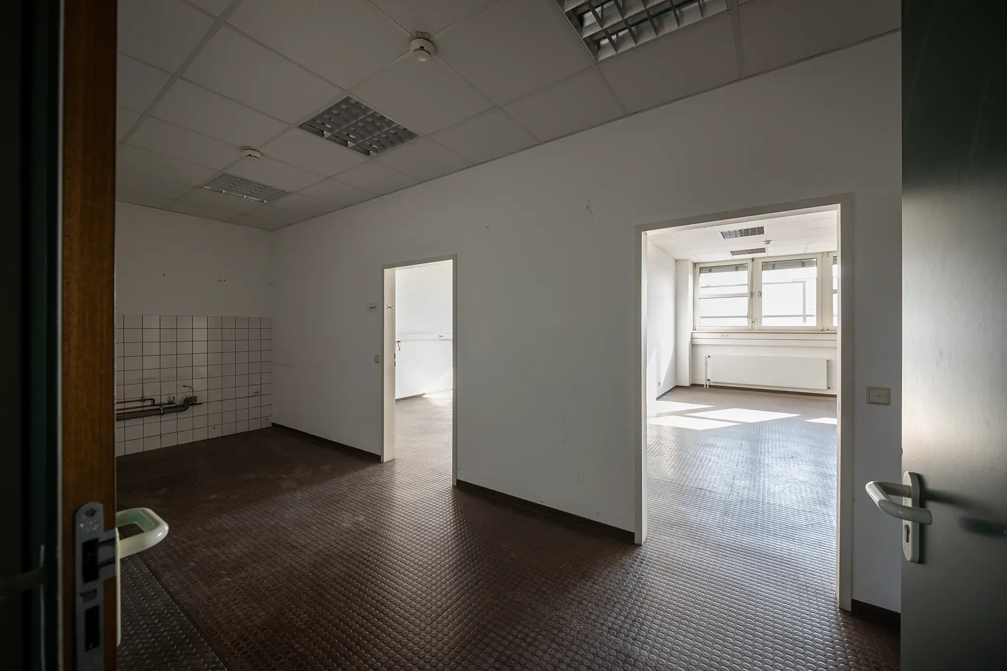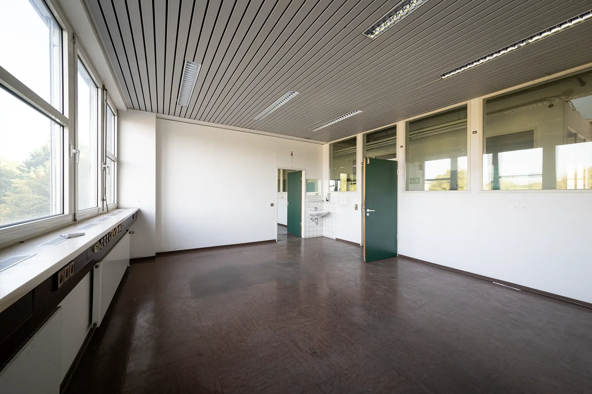 Der erste Eindruck bestätigte sich dann bei der Besichtigung des Werkstattgebäudes F260, ganz oben im dritten Stock. Was man dort fand? Rund 830 Quadratmeter Fläche, Beton, PVC-Boden, hohe Decken, viel Licht – aber auch Kälte, Staub und baulicher Charme der 80er Jahre. Heizung? Fehlanzeige. Steckdosen? Der Strom auf dem gesamten Gelände war schon seit Monaten abgestellt. Brandschutz? Undenkbar.