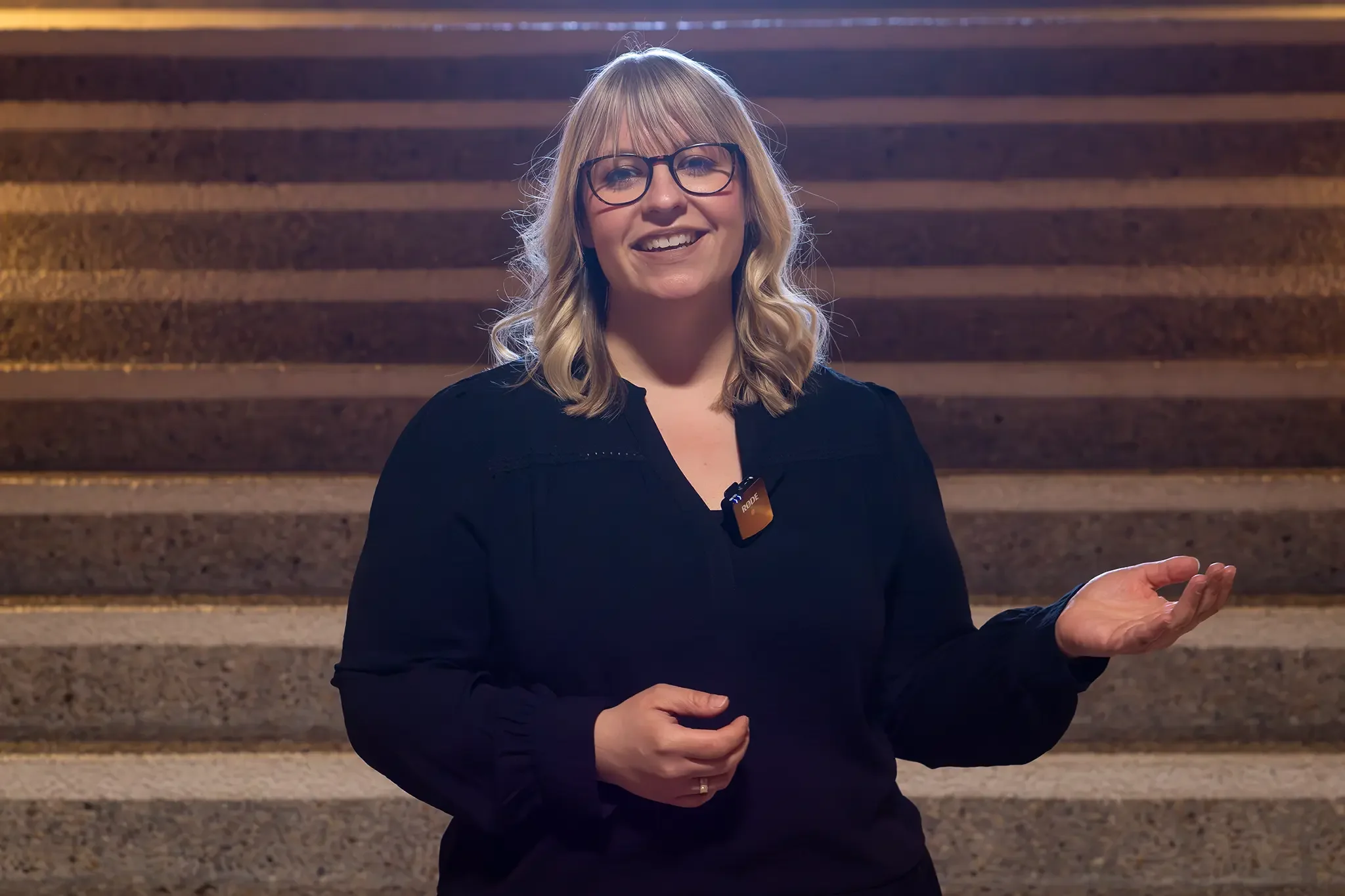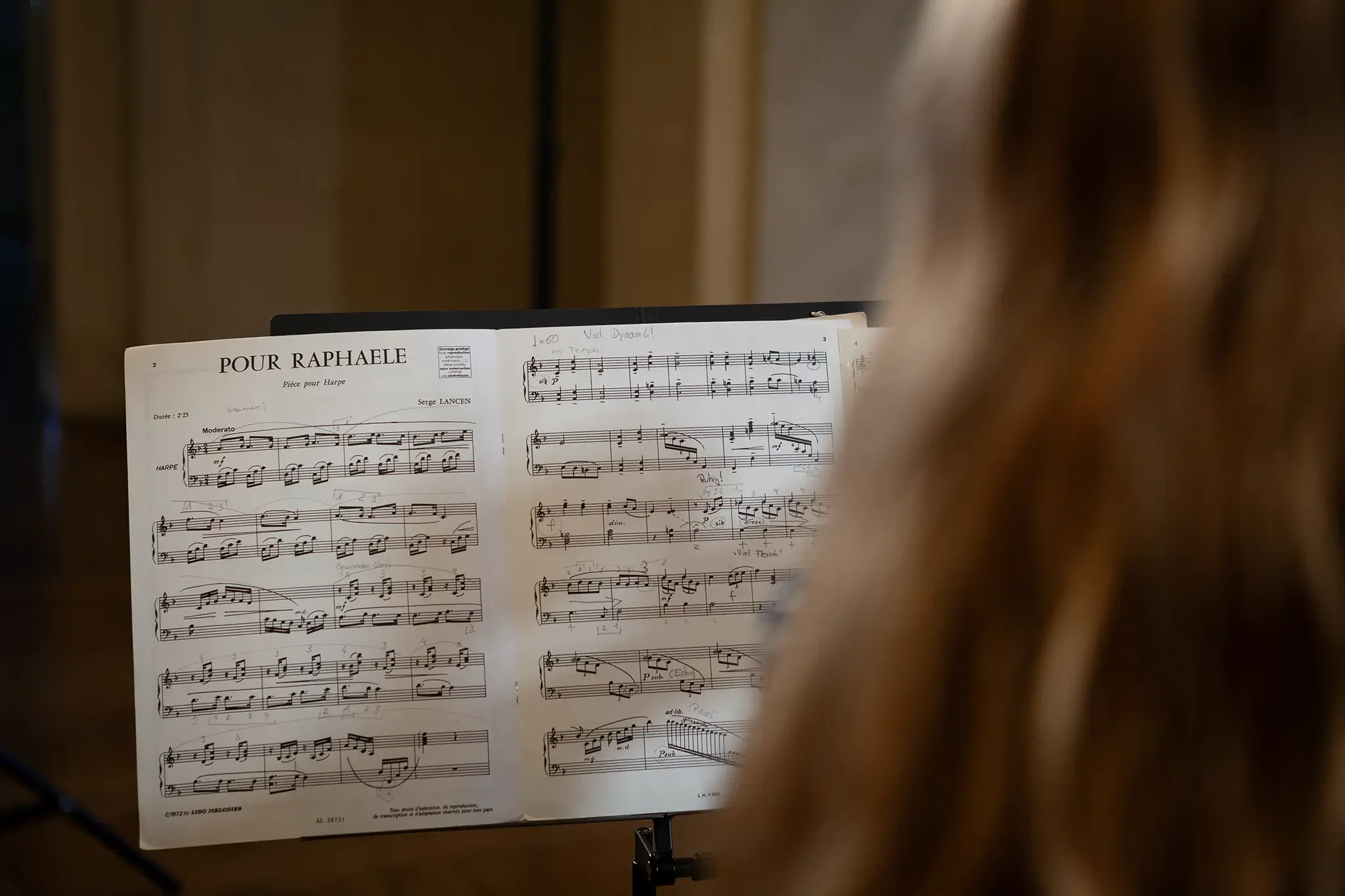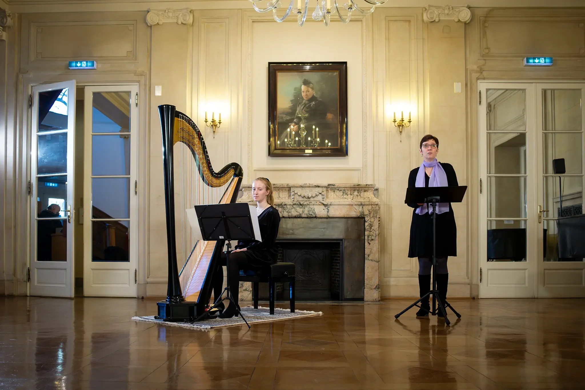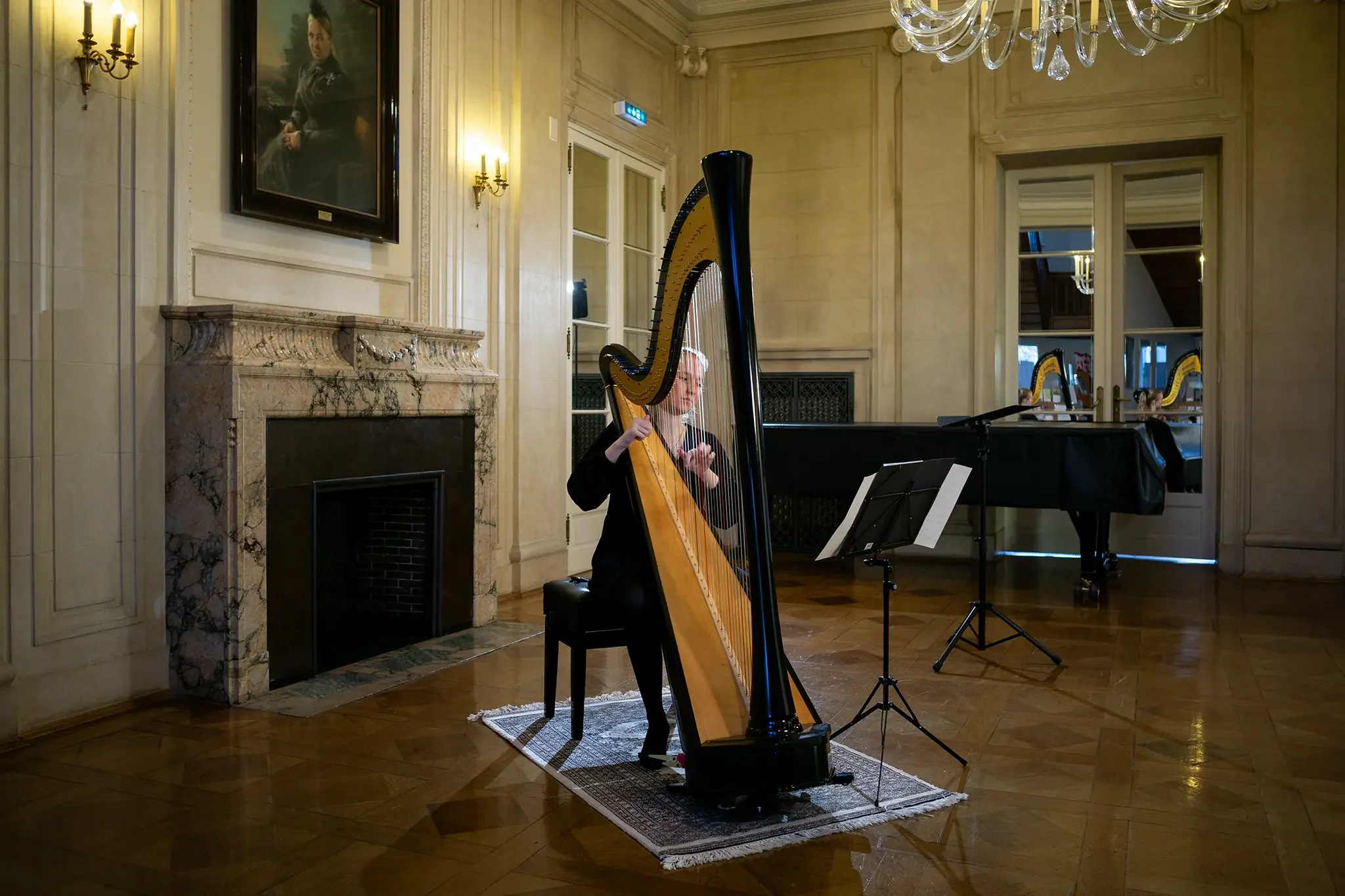 Die Villa Zanders bietet eine einzigartige Atmosphäre. Wo sonst Kunst ausgestellt wird, gab es nun Texte aus dem Leben von Maria Zanders. Untermalt wurde die Lesung von vorweihnachtlichen Harfenklängen. Für mich als Fotografen war dabei besonders angenehm, dass ich mit Licht spielen konnte. Die Szenerie musste natürlich für die Videos von vorne beleuchtet werden. Aber zusätzlich hatte ich noch die Möglichkeit, ein Gegenlicht zu setzen. Mit diesem Licht kommen die Saiten der Harfe besonders schön zum Vorschein.