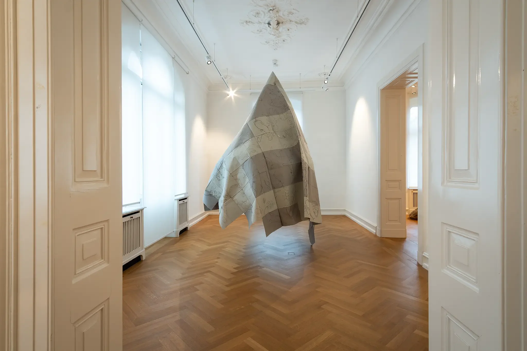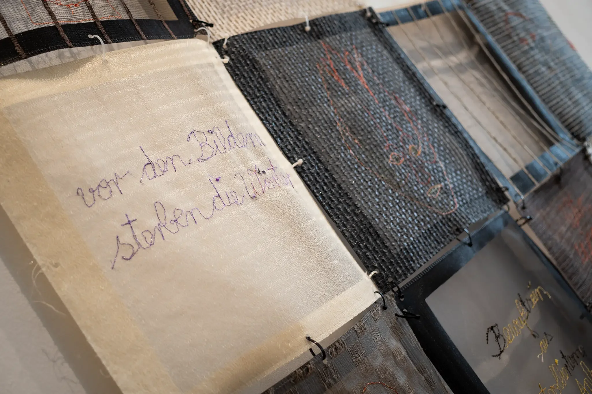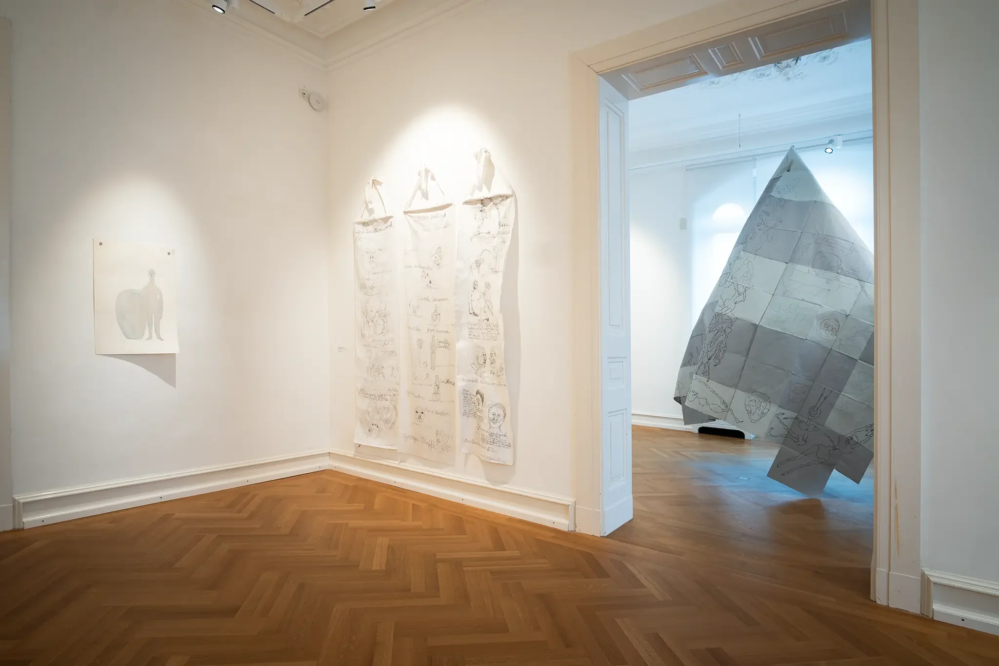 In Ihrer Ausstellung "Der Künstlerinnen-Komplex" beschäftigt sich Carola Willbrand mit Künstlerinnen, die sie im Laufe ihres Lebens getroffen und die sie geprägt haben. Dabei findet man neben Zeichnungen und verschiedenen Skulpturen, sehr viele Arbeiten auf oder mit Stoff. Sehr beeindruckend ist die fast raumfüllende Installation "HimmelHölleKleid". Mit Nadel und Faden zeichnet sie Motive eines Totentanz auf den Stoff. Und das, obwohl Willbrand selbst sagt, dass Handarbeit für sie "das allerletzte" gewesen sei.