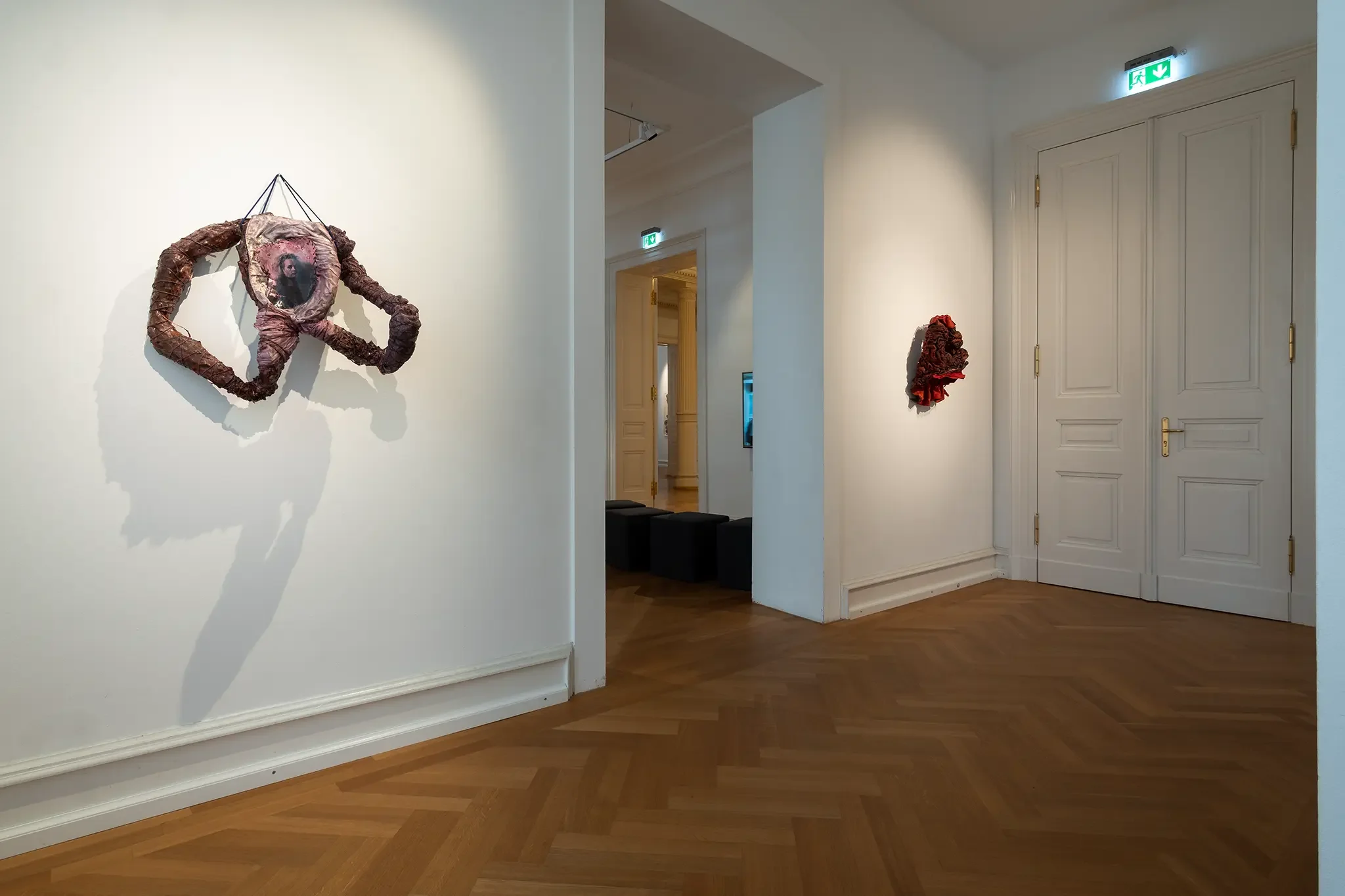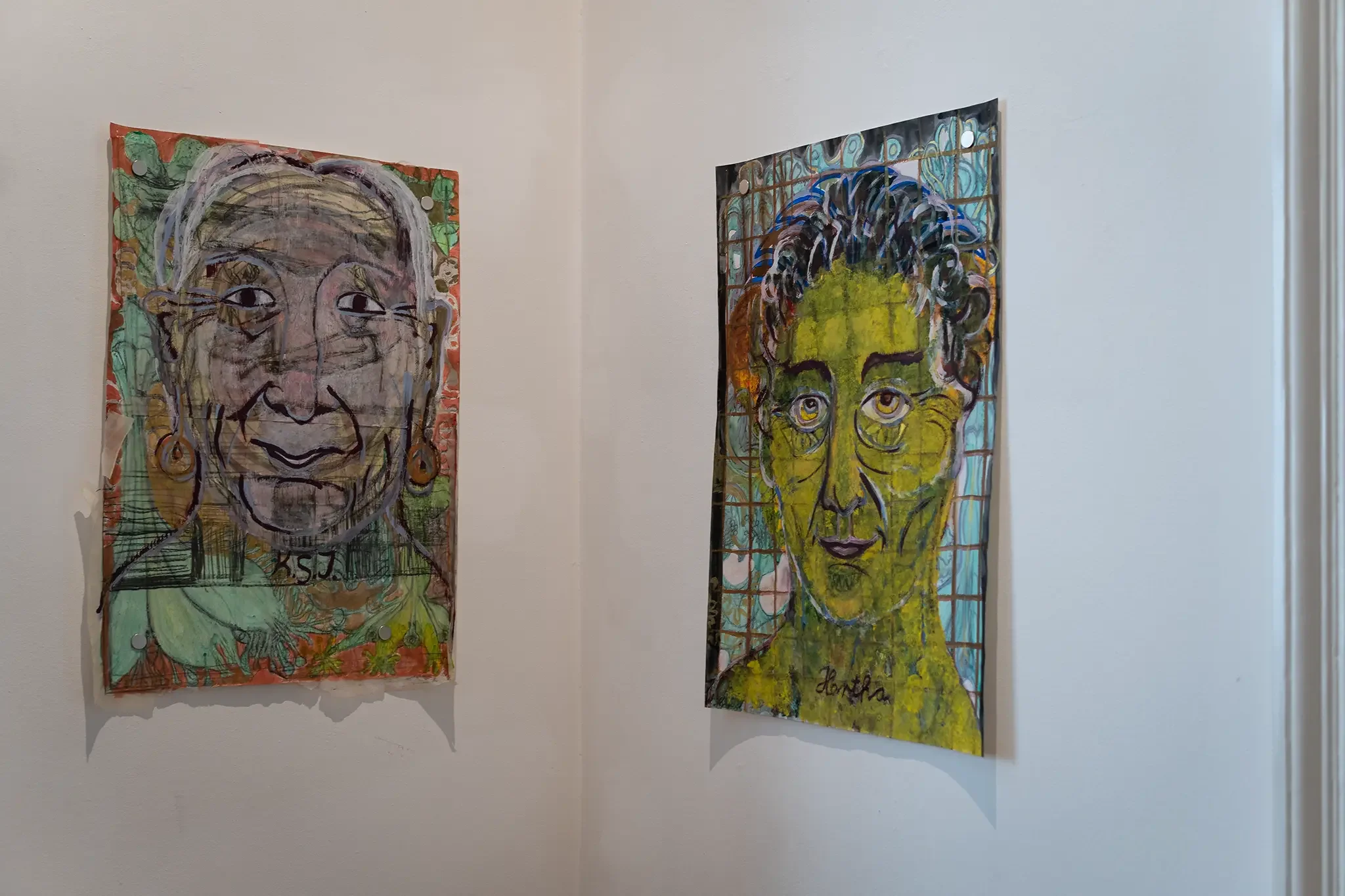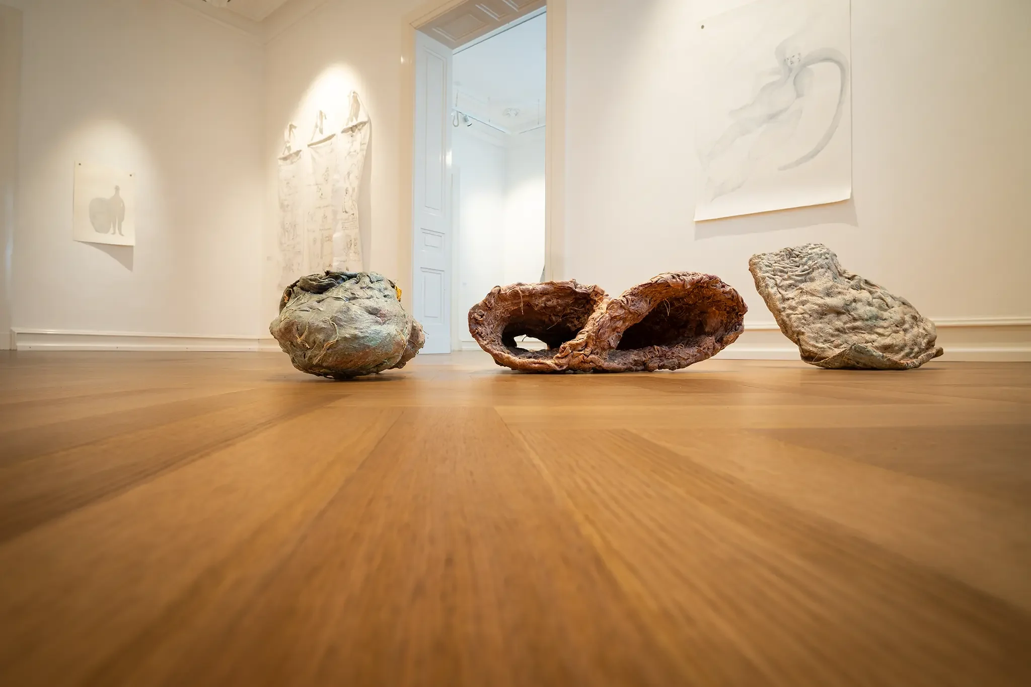 In Ihrer Ausstellung "Der Künstlerinnen-Komplex" beschäftigt sich Carola Willbrand mit Künstlerinnen, die sie im Laufe ihres Lebens getroffen und die sie geprägt haben. Dabei findet man neben Zeichnungen und verschiedenen Skulpturen, sehr viele Arbeiten auf oder mit Stoff. Sehr beeindruckend ist die fast raumfüllende Installation "HimmelHölleKleid". Mit Nadel und Faden zeichnet sie Motive eines Totentanz auf den Stoff. Und das, obwohl Willbrand selbst sagt, dass Handarbeit für sie "das allerletzte" gewesen sei.