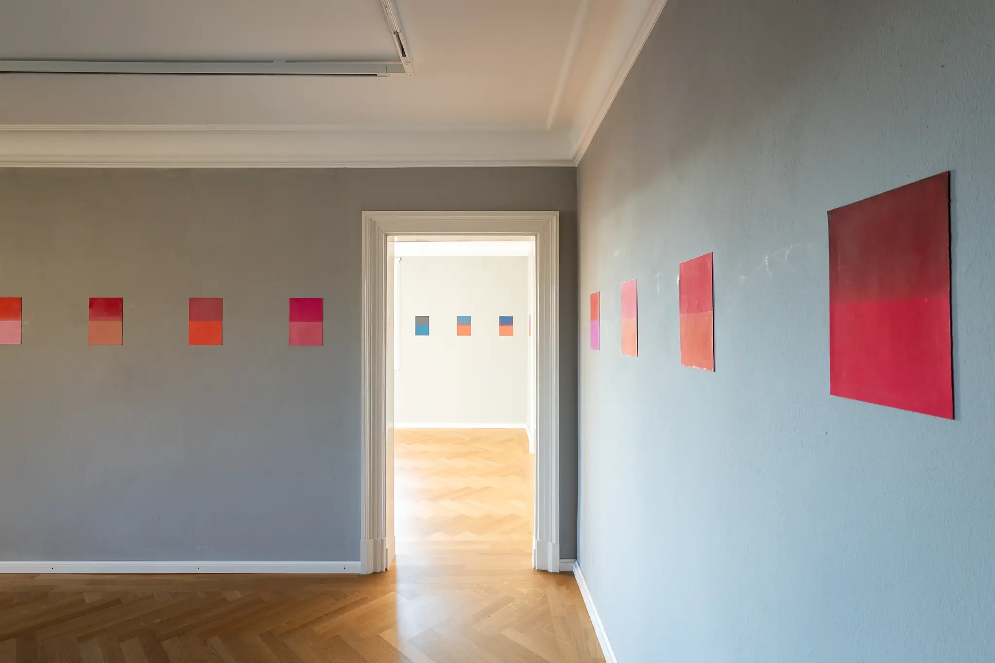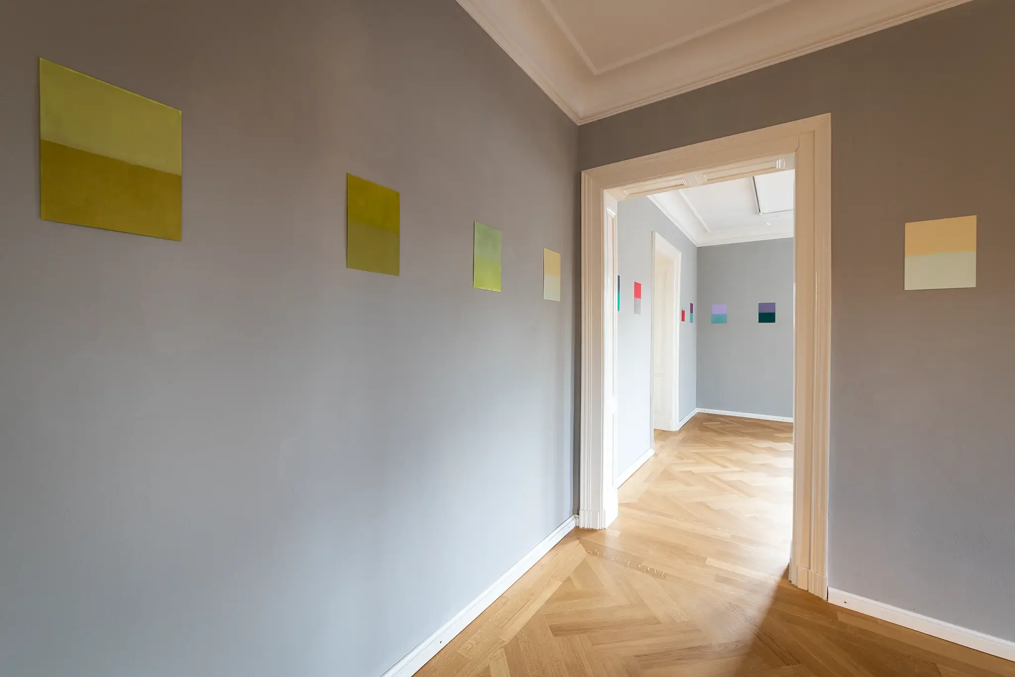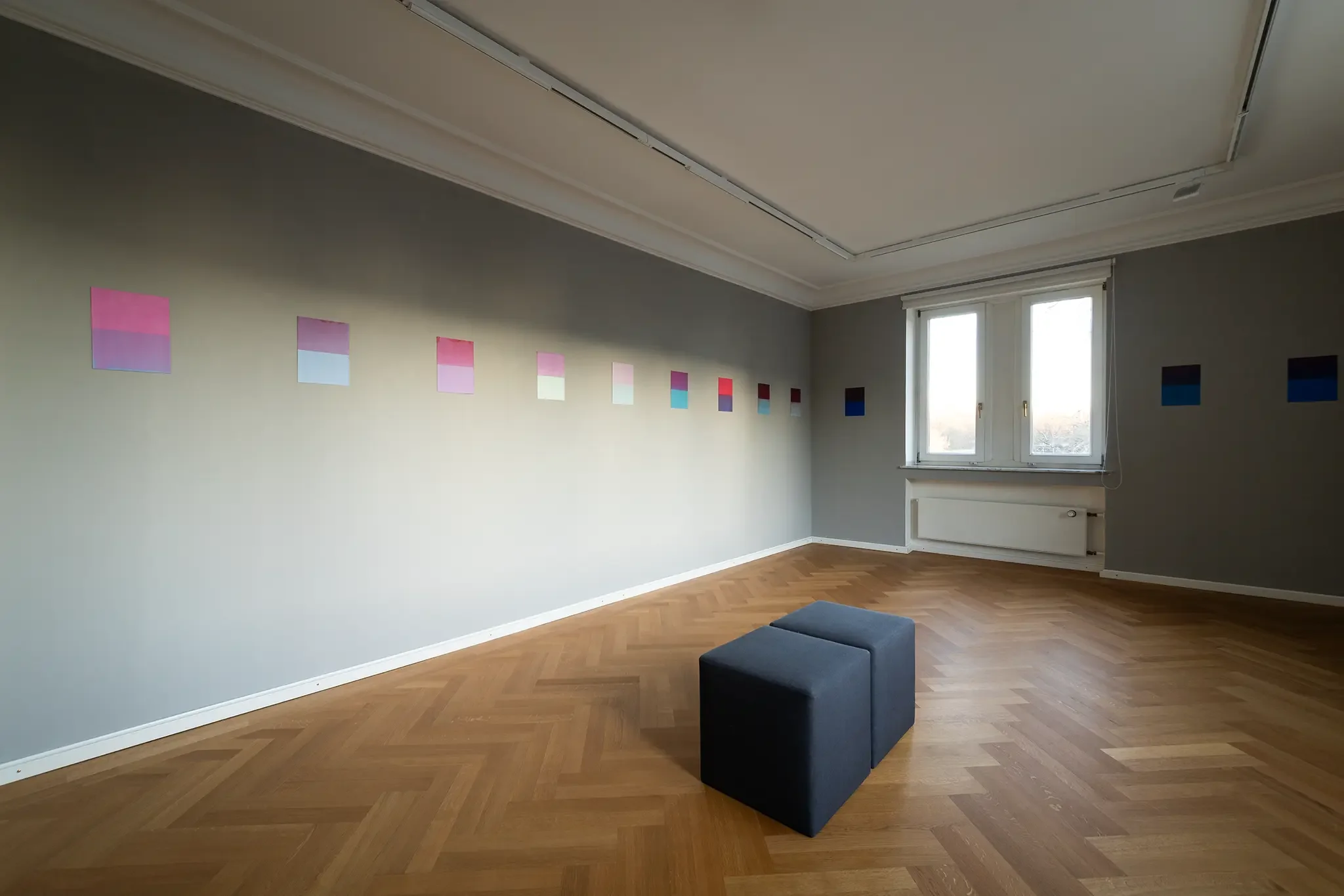 Es muss ungemein viel Arbeit gewesen sein, 221 Bilder so exakt zu hängen. Gleiche Höhe, gleicher Abstand, einem farblichen Konzept folgend. Dabei wirken die einzelnen Bilder, allesamt Unikate, schon für sich. Jedes Blatt ist handgemacht. Zuerst wurde eine Farbe aufgetragen, dann musste es trocknen und im nächsten Schritt wurde die zweite Farbe aufgetragen. Alles streng getrennt in der exakten Mitte der DIN A4-Bätter.