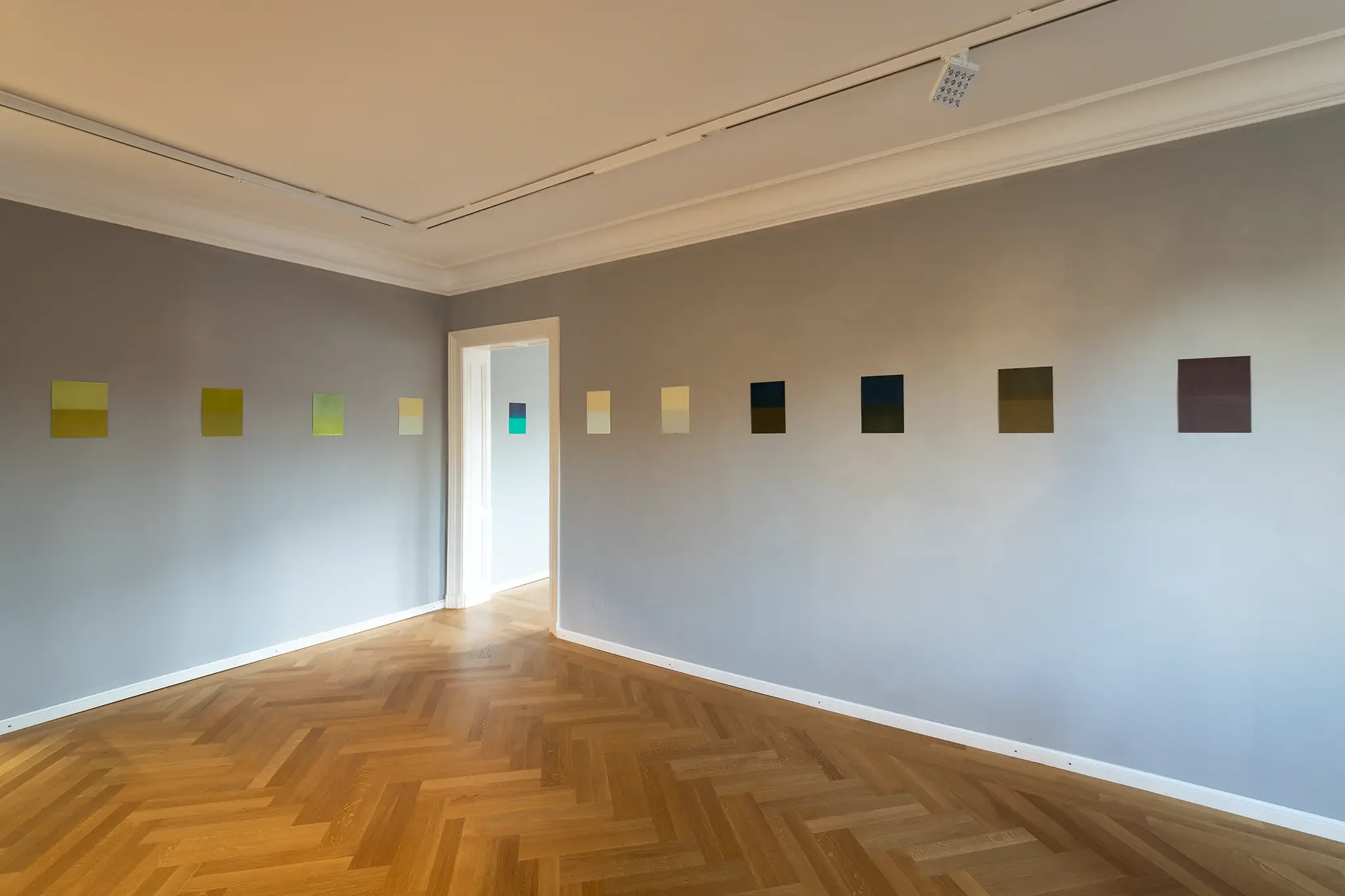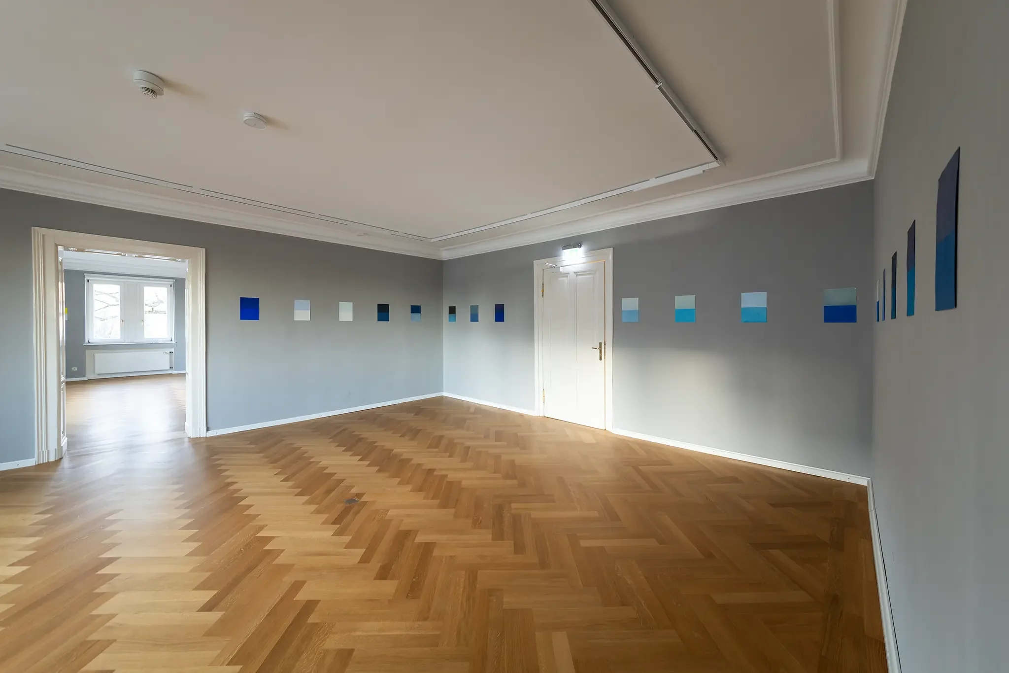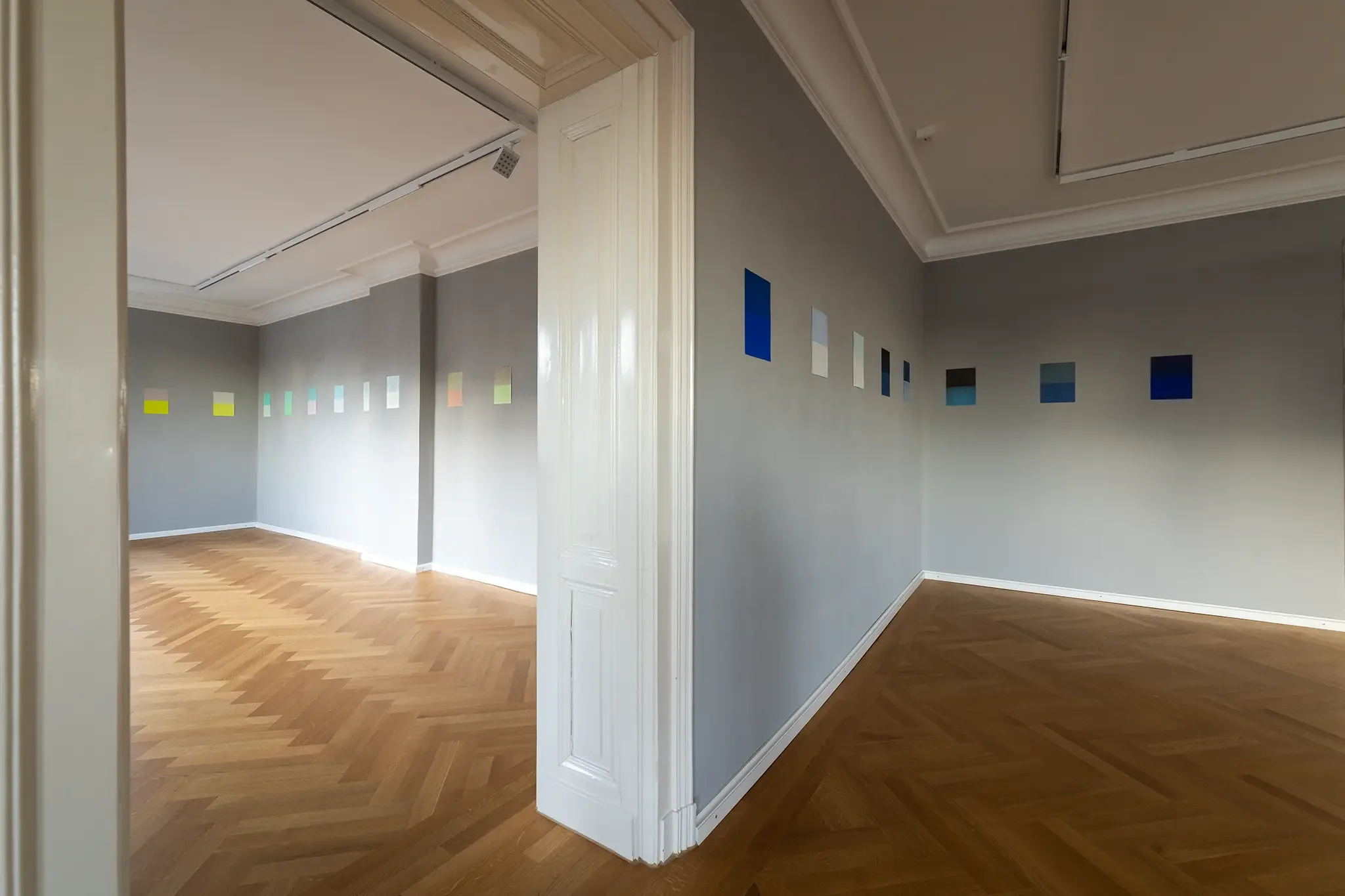 Es muss ungemein viel Arbeit gewesen sein, 221 Bilder so exakt zu hängen. Gleiche Höhe, gleicher Abstand, einem farblichen Konzept folgend. Dabei wirken die einzelnen Bilder, allesamt Unikate, schon für sich. Jedes Blatt ist handgemacht. Zuerst wurde eine Farbe aufgetragen, dann musste es trocknen und im nächsten Schritt wurde die zweite Farbe aufgetragen. Alles streng getrennt in der exakten Mitte der DIN A4-Bätter.